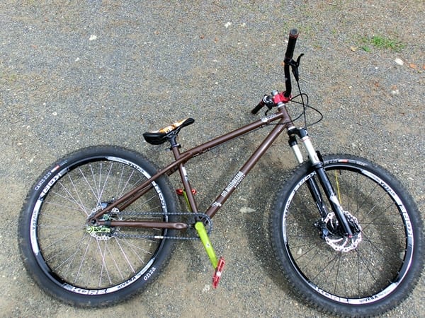 フロントフォークは短めシングルスピードで、かなりのアップハンドル仕様。